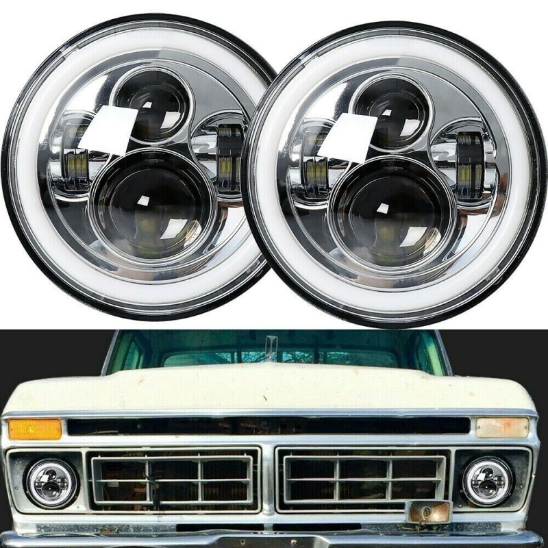 UNIVERSAL LED 7" ROUND HEADLIGHTS PROJECTOR WHITE HALO HIGH LOW BEAM PAIR