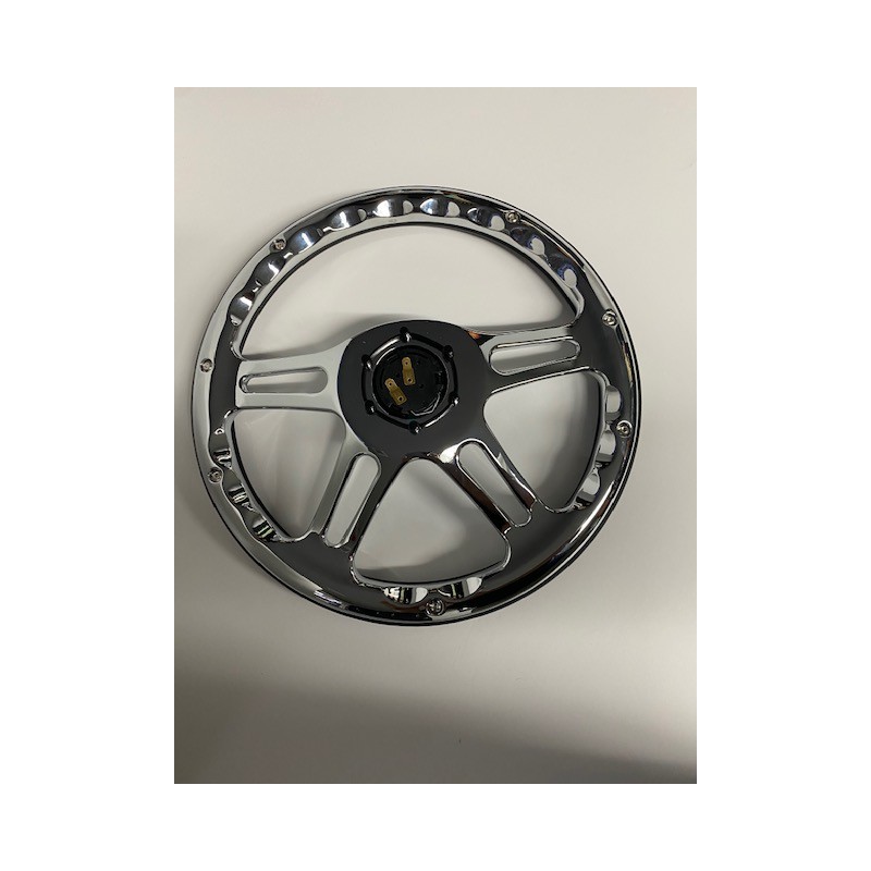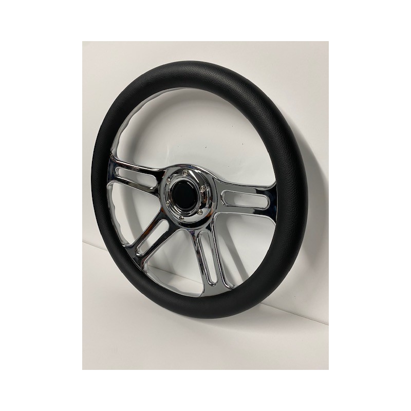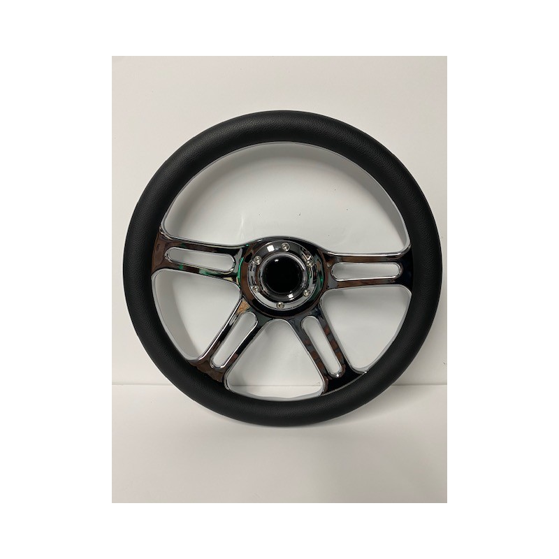 UNIVEERSAL 6 HOLE STEERING WHEEL BLACK LEATHER STYLE WITH CHROME 4 SPOKE CENTER