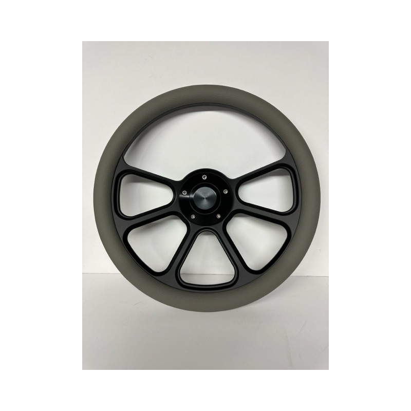 14"BLACK BILLET 3 SPOKE STEERING WHEEL 5 HOLE WITH GREY SLEEVE WRAP