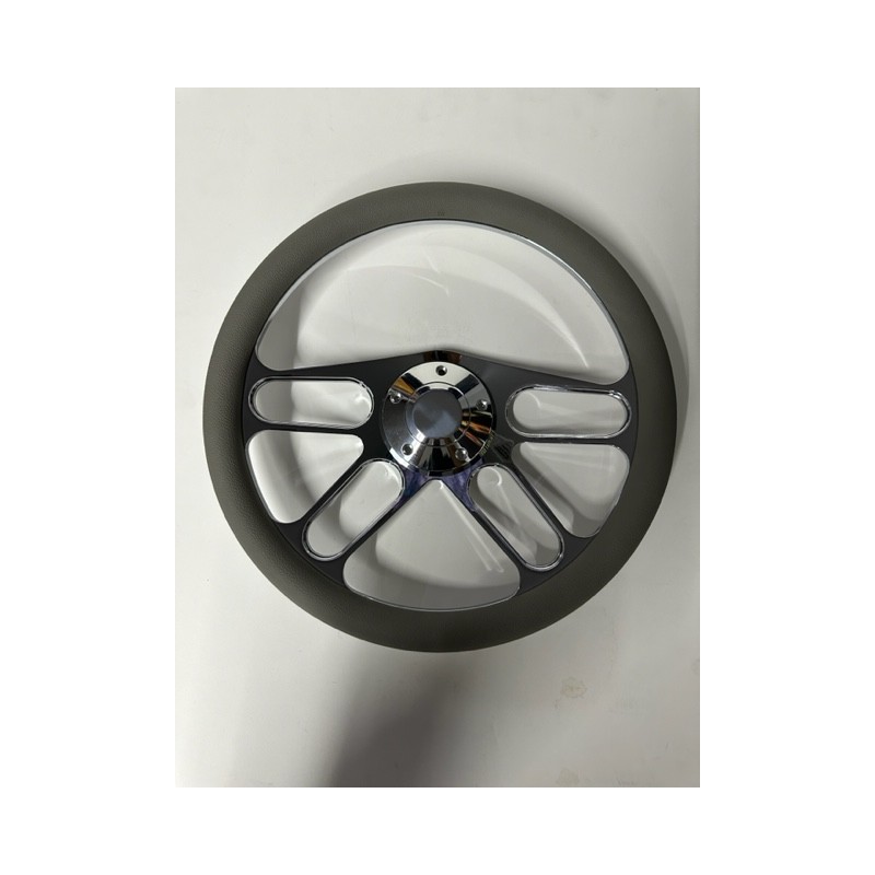 NEW 4 SPOKE CHROME BILLET GREY WRAP STEERING WHEEL 6 HOLE 14" WITH BILLET HORN BUTTON