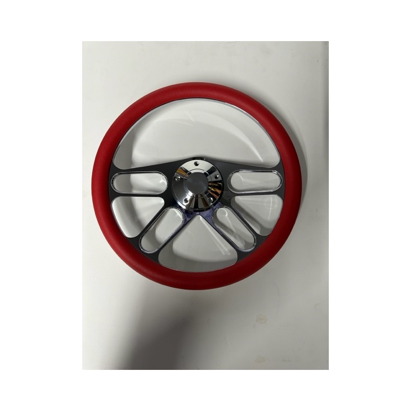 CHROME 4 SPOKE BILLET STEERING WHEEL UNIVERSAL 14" 6 HOLE WITH RED WRAP